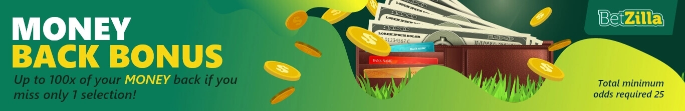 Congrats! Your bet has the potential to qualify for our MONEY BACK BONUS if just 1 team loses & the total odds of the remaining selections are above 25.0!